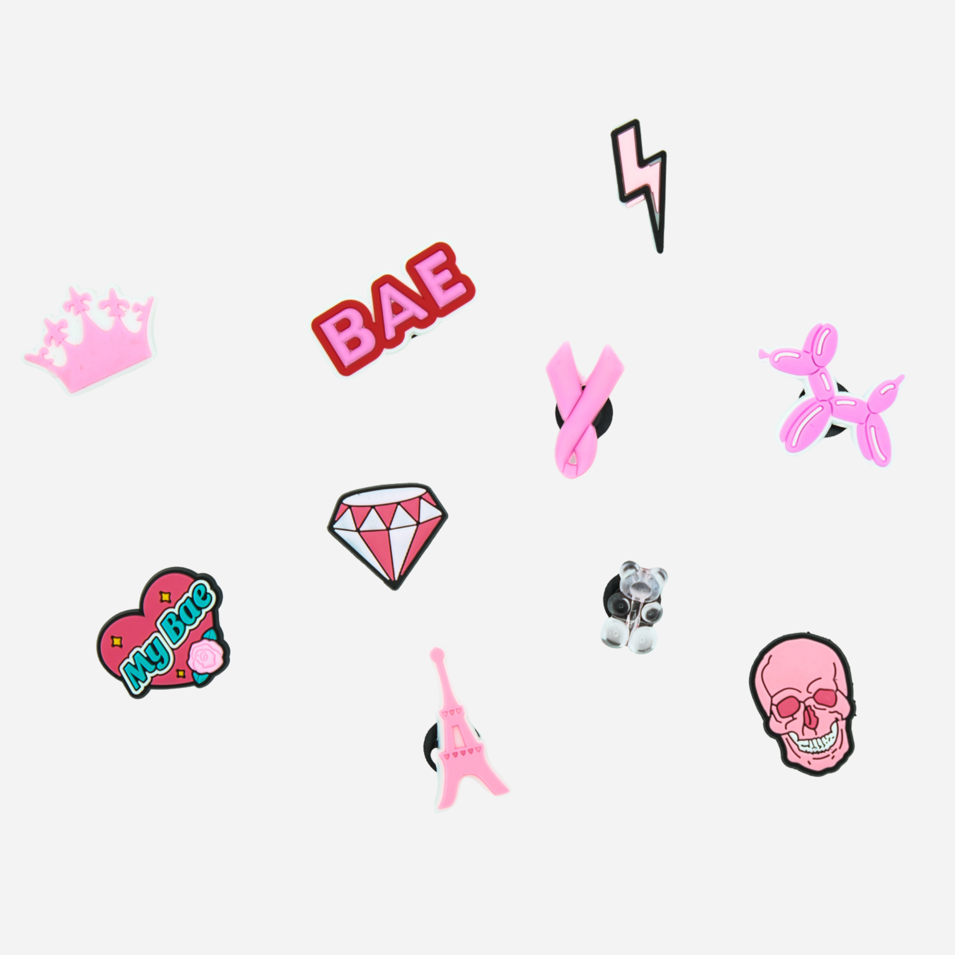 Verleihe deinen Schuhen mit einzigartigen Designs eine persönliche Note: BAE, ein pinkfarbener Blitz, eine Königin, eine Krone. Diese Anstecker sind perfekt, um deinen Look mit einem kühnen und modernen Stil zu individualisieren und eignen sich für alle, die ihre Persönlichkeit stilvoll und mit einem Hauch Rebellion zum Ausdruck bringen möchten.